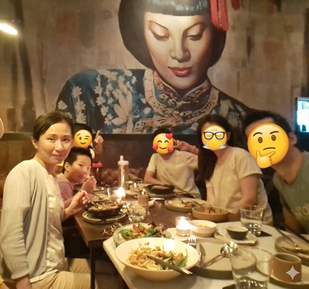 感官饗宴: 餐廳的燈光昏黃溫暖,桌上的燭光映照著美味的南洋料理。大家在壁畫前圍坐,分享著今日的分流冒險故事,互相關心王家孩子的康復。這頓晚餐不只是味蕾的享受,更是家庭間情感交流的優雅時刻。